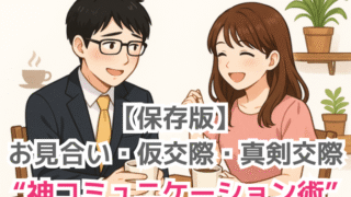 お見合い 【保存版】お見合い・仮交際・真剣交際の“神コミュニケーション術” 婚活の現場で本当に効くのは「面白く話す力」よりも、相手に気持ちよく喋ってもらう設計です。本記事は、お見合い/仮交際/真剣交際の3フェーズで使える“実戦テク”をkotopuro流に整理しました。 第1章:お見合い編 “軽い自己開示”で距離を一... 2025.10.08 お見合い仮交際男性向け
